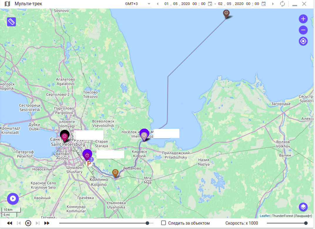 Рисунок 1. Мульти-трек - диаграмма, демонстрирующая перемещение выбранных объектов мониторинга на заданном промежутке времени
