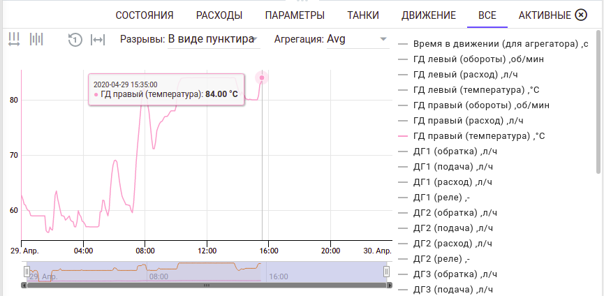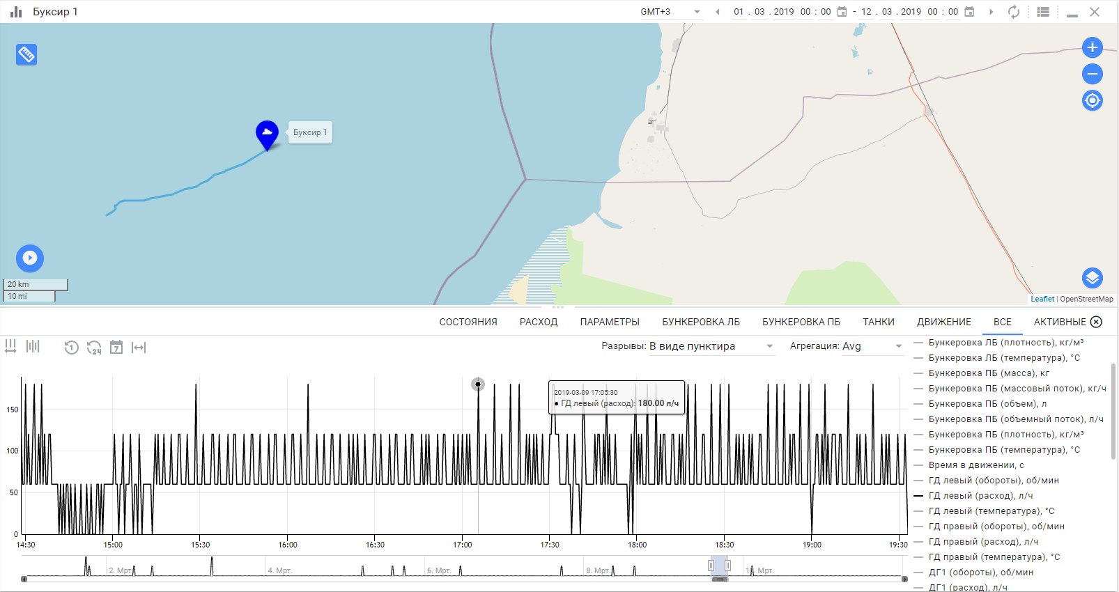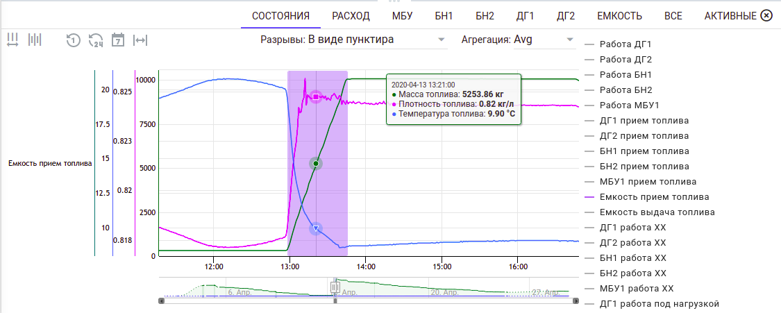 Рисунок 13. График с несколькими параметрами при бункеровке (состояние бункеровки, плотности топлива, температуры топлива)