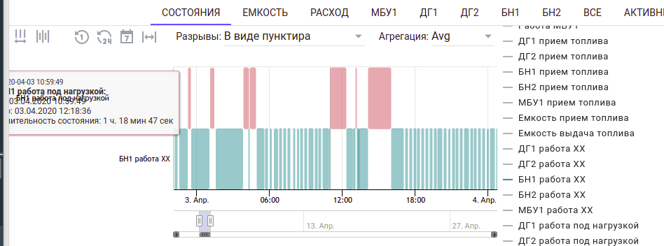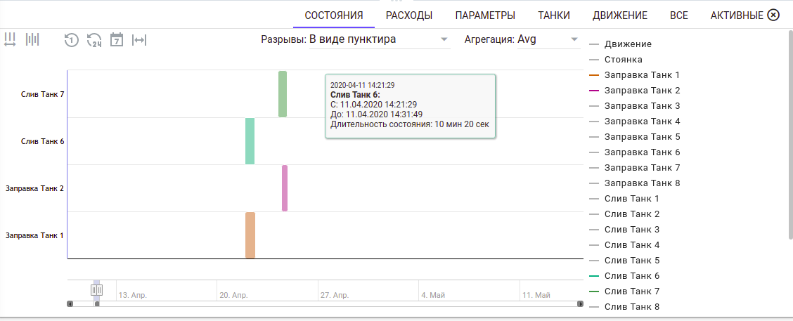 Рисунок 8. Отображение состояний бункеровки и состояний слива для разных емкостей с указанием времени и длительности